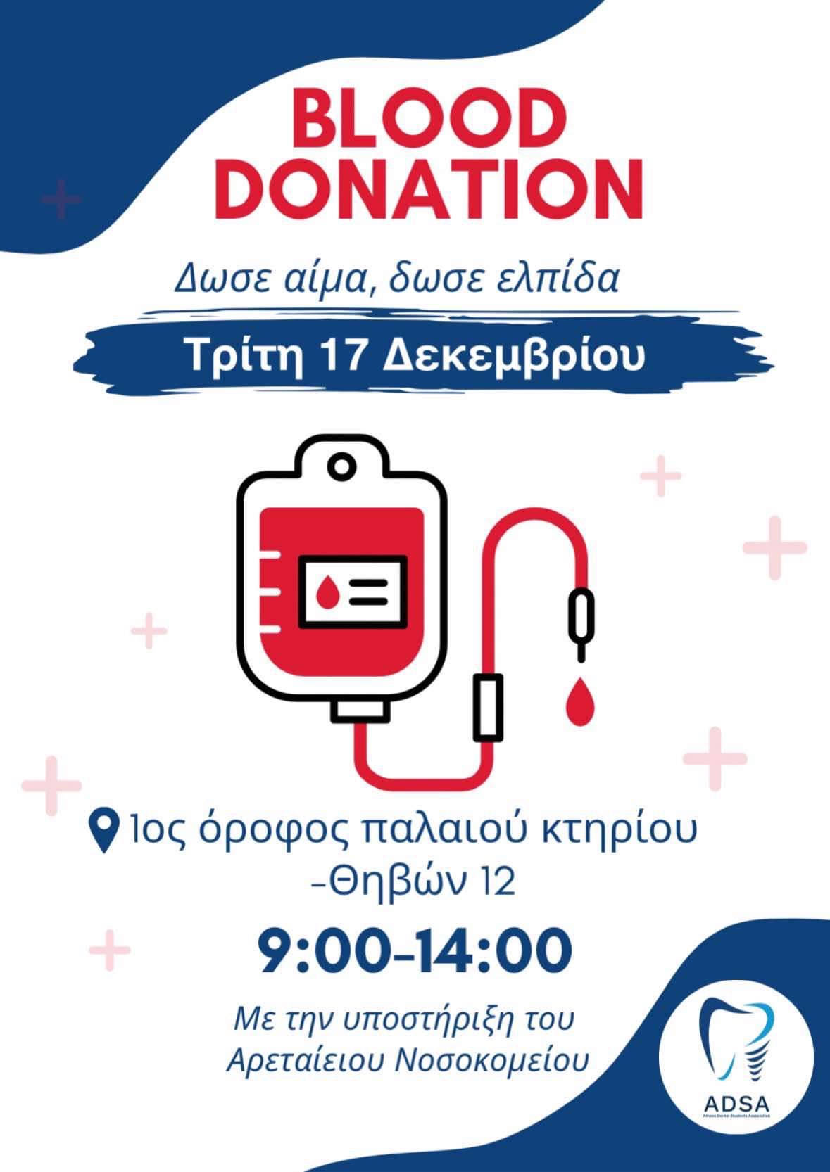 H ADSA με την υποστήριξη του Αρεταίειου Νοσοκομείου διοργανώνουν αιμοδοσία την Τρίτη 17 Δεκεμβρίου 9:00 - 14:00 στον 1ο όροφο του Παλαιού Κτηρίου της Οδοντιατρικής Σχολής ΕΚΠΑ.