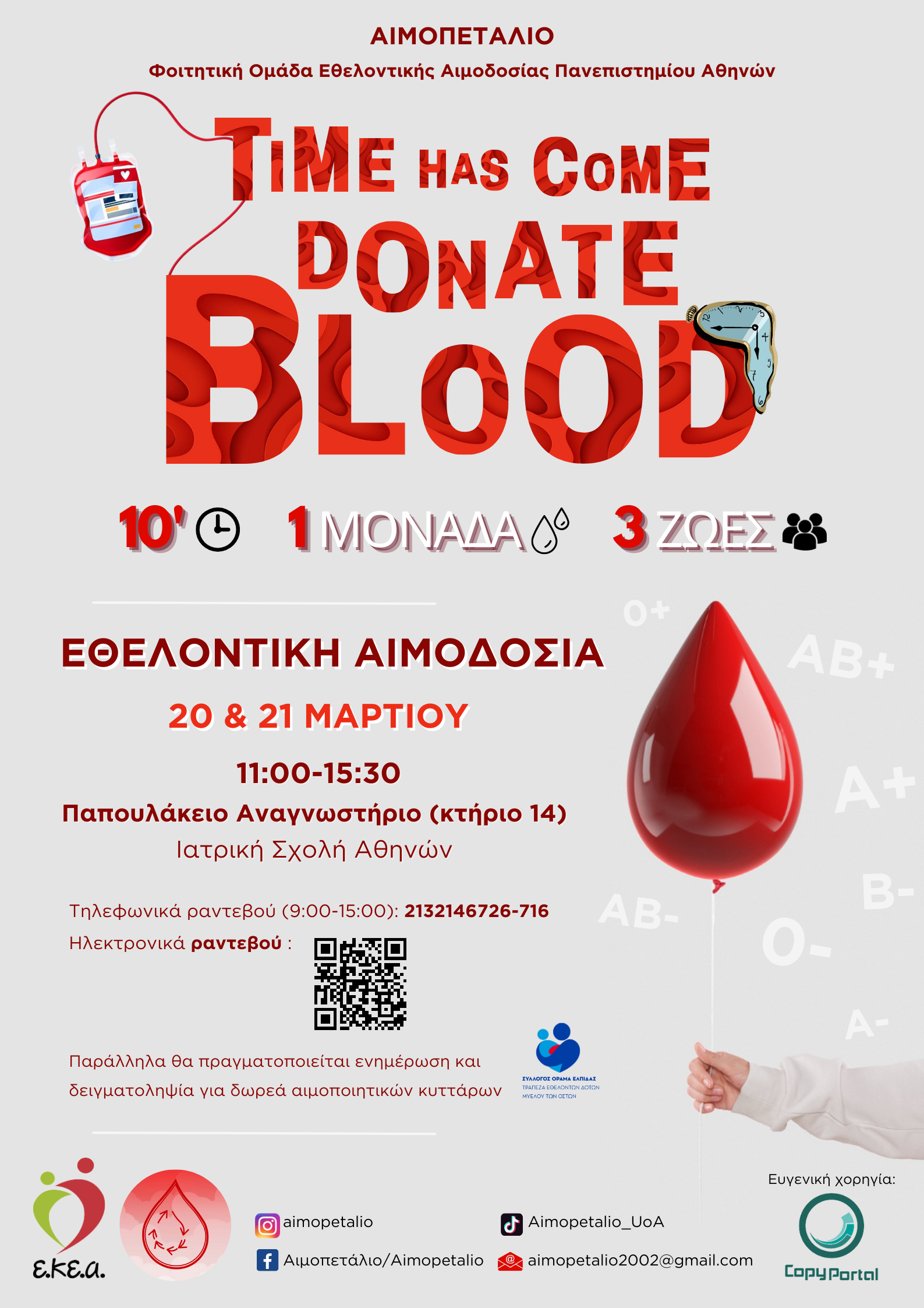 Σας προσκαλούμε στην εθελοντική αιμοδοσία του Αιμοπεταλίου την Τετάρτη 20 και την Πέμπτη 21 Μαρτίου 2024, στο Παπουλάκειο Αναγνωστήριο (Κτήριο 14) της Ιατρικής Σχολής, ώρες 11:00-15:30, σε συνεργασία με το Ε.ΚΕ.Α.