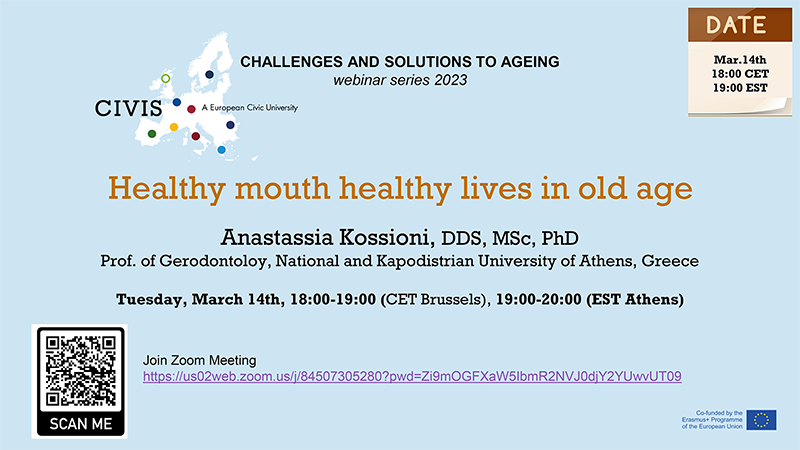 Το CIVIS Hub «Υγεία» σας προσκαλεί στο διαδικτυακό σεμινάριο της κ. Αναστασίας Κοσιώνη, Καθηγήτριας Γηροδοντιατρικής του Εθνικού και Καποδιστριακού Πανεπιστημίου Αθηνών με θέμα: «Υγιές στόμα, υγιής ζωή στις μεγαλύτερες ηλικίες»