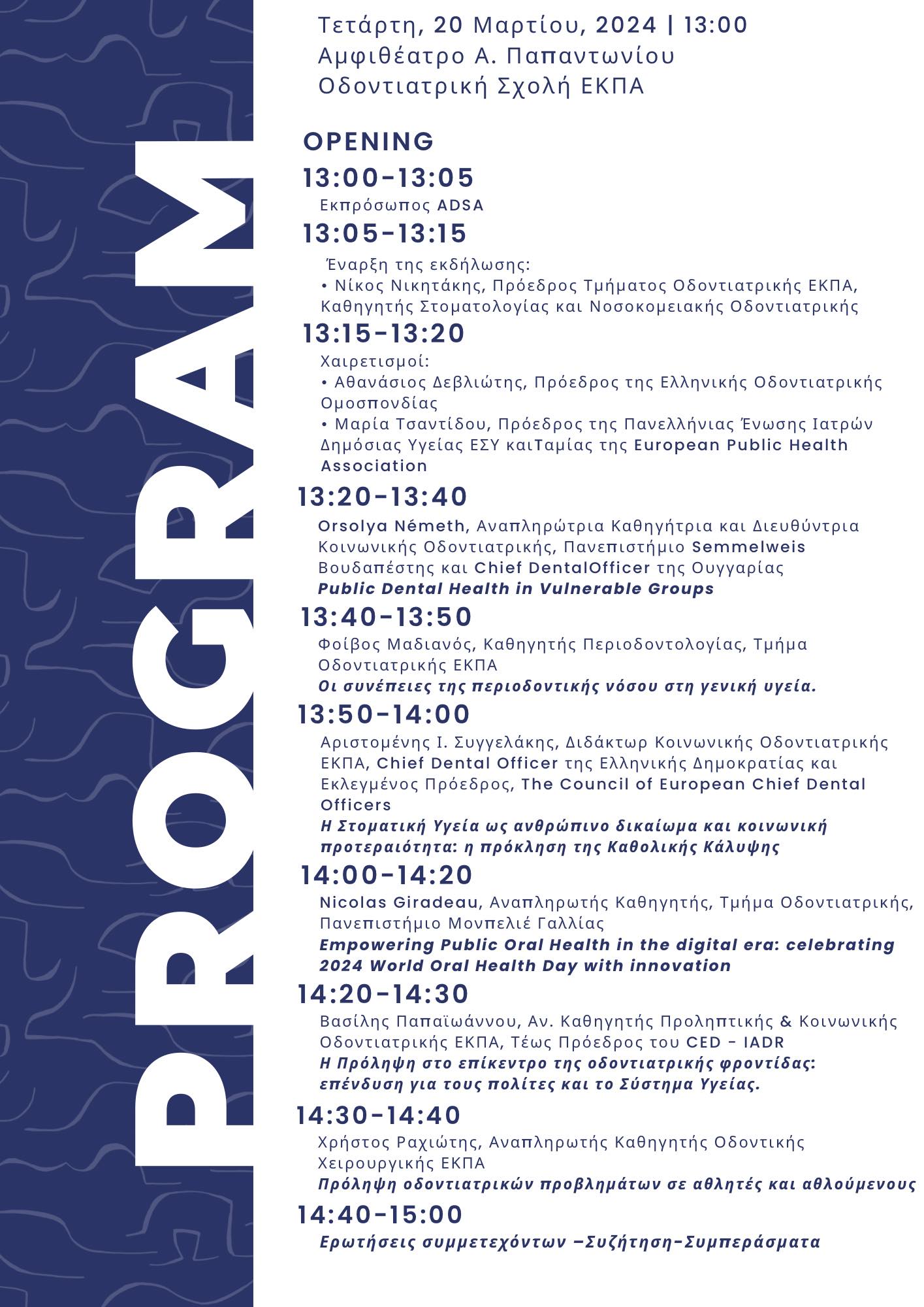 Τετάρτη 20 Μαρτίου 2024 13:00-15:00 Αμφιθέατρο ΑΕΠ Οδοντιατρικής Σχολής ΕΚΠΑ