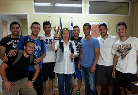 Στη φωτογραφία η Πρόεδρος της Οδοντιατρικής Καθηγήτρια κα Αικατερίνη Καραγιάννη συγχαίρει τους παίχτες της ομάδας για τη διάκριση.