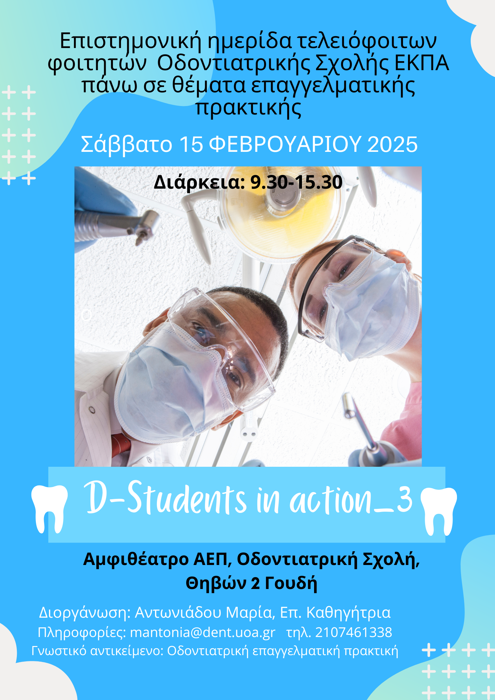 Σας ανακοινώσουμε τη διοργάνωση του "D Students in Action 3", το οποίο θα πραγματοποιηθεί το Σάββατο 15 Φεβρουαρίου 2025. Η εκδήλωση αυτή είναι μια μοναδική ευκαιρία για τους φοιτητές και το προσωπικό της σχολής μας, καθώς και για τους συναδέλφους που ενδιαφέρονται να συμμετάσχουν, να ενημερωθούν και να εμπλακούν σε θέματα αιχμής που σχετίζονται με την οδοντιατρική πρακτική, την έρευνα και την εκπαίδευση τα οποία μελέτησαν και παρουσιάζουν οι 5ετείς φοιτητές του τμήματος (τελειόφοιτοι).