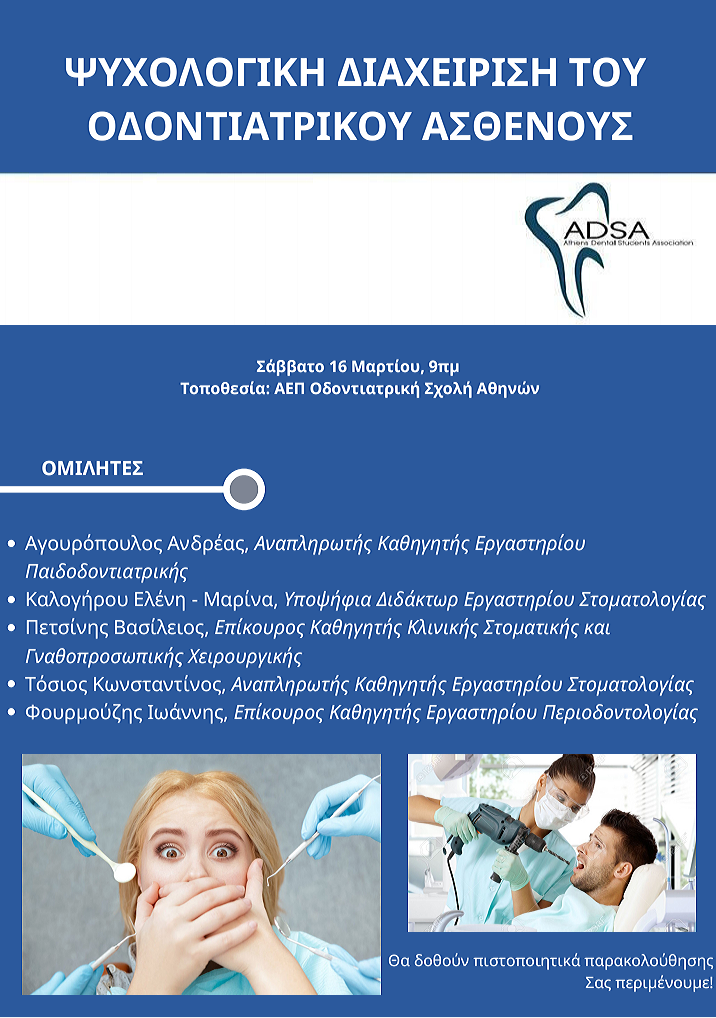 Η ημερίδα του Athens Dental Students' Association – ADSA με θέμα “Η ψυχολογική διαχείριση του οδοντιατρικού ασθενούς” θα πραγματοποιηθεί το Σαββατο 16 Μαρτίου 9πμ στο αμφιθέατρο ΑΕΠ της Οδοντιατρικής Σχολής Αθηνών.