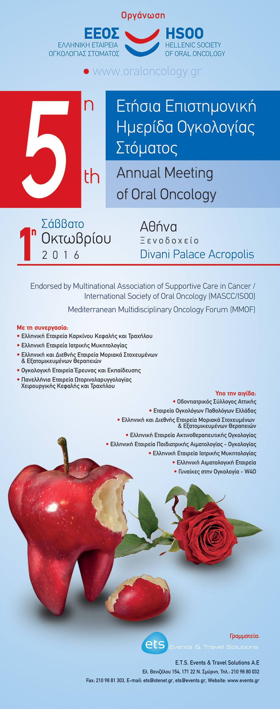 Σάββατο 1η Οκτωβρίου 2016, 5η Ετήσια Επιστημονική Ημερίδα Ελληνικής Εταιρείας Ογκολογίας Στόματος.