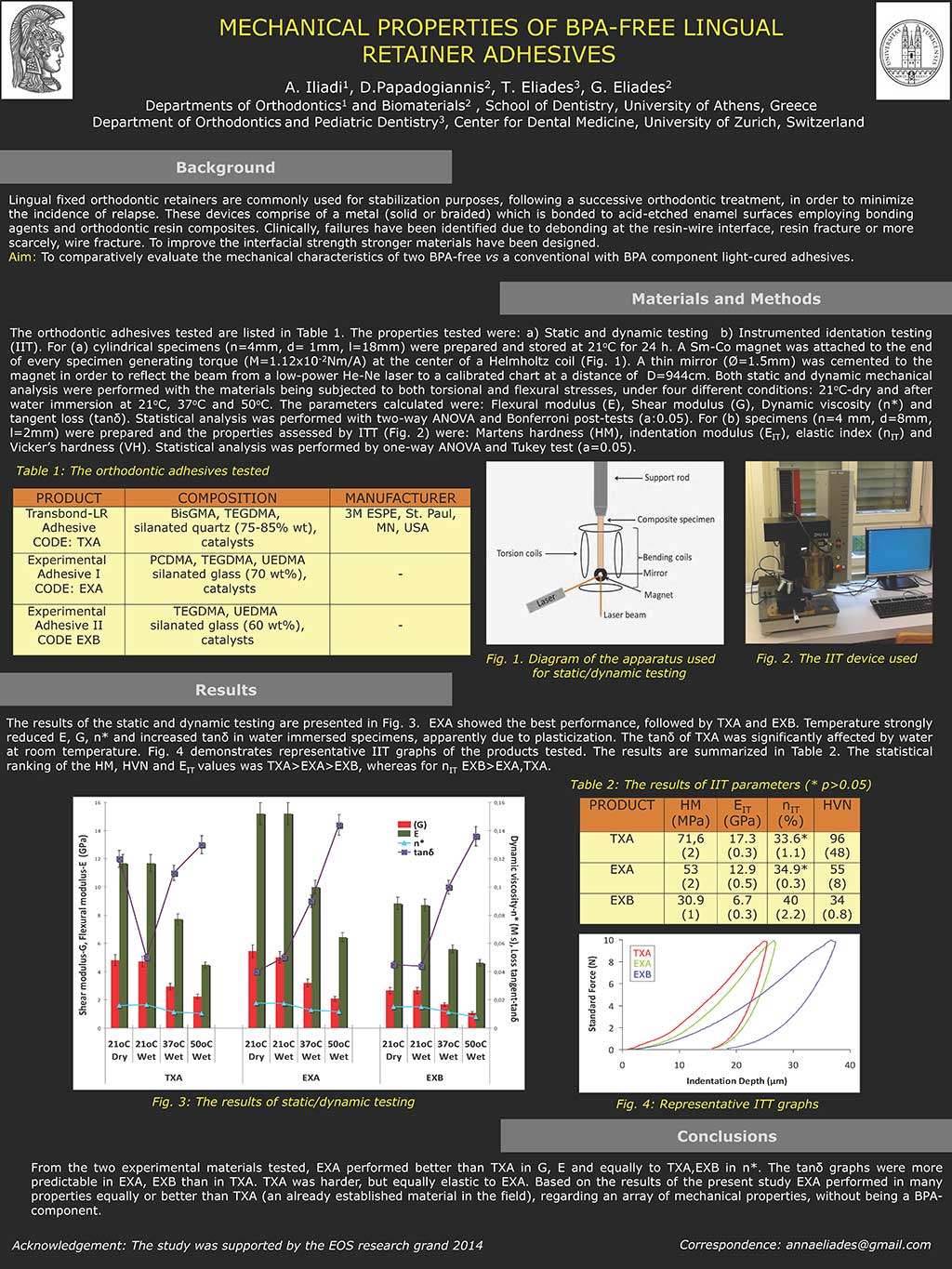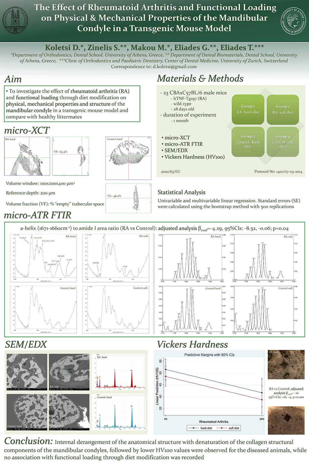 Κατά τη διάρκεια του 91ου Συνεδρίου της Ευρωπαϊκής Ορθοδοντικής Εταιρείας, η Οδοντιατρική Σχολή έλαβε δύο σημαντικές διακρίσεις για επιστημονικές παρουσιάσεις. Το βραβείο Houston επιτοίχιας παρουσίασης έλαβε η εργασία των Δ. Κωλέτση, Σ. Ζηνέλη, Μ. Μάκου, Γ. Ηλιάδη και Θ. Ηλιάδη με τίτλο “The effect of rheumatoid arthritis and functional loading on physical & mechanical properties of the mandibular condyle in a transgenic mouse model”, που αποτελεί συνεργασία των Εργαστηρίων Ορθοδοντικής και Βιοϋλικών του ΕΚΠΑ και του Εργαστηρίου Ορθοδοντικής και Παιδοδοντιατρικής του Πανεπιστημίου της Ζυρίχης. Βραβείο καλύτερης επιτοίχιας παρουσίασης έλαβε η εργασία των Α. Ηλιάδη, Δ. Παπαδογιάννη, Θ. Ηλιάδη και Γ. Ηλιάδη με τίτλο “Μechanical properties of BPA-free lingual retainer adhesives”, που αποτελεί επίσης συνεργασία των Εργαστηρίων Ορθοδοντικής και Βιοϋλικών του ΕΚΠΑ και του Εργαστηρίου Ορθοδοντικής και Παιδοδοντιατρικής του Πανεπιστημίου της Ζυρίχης