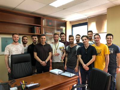 Στη φωτογραφία, αμέσως μετά το τέλος του παιχνιδιού, ο Πρόεδρος της Σχολής Καθηγητής κ. Φοίβος Μαδιανός συγχαίρει τους φοιτητές που συμμετείχαν στην πρωταθλήτρια ομάδα.