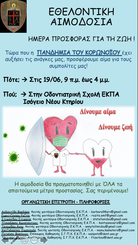 Εθελοντική αιμοδοσία στην Οδοντιατρική, Παρασκευή 19.06.2020