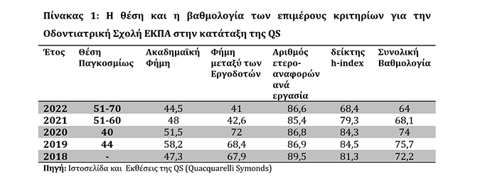 Πίνακας 1. Η θέση και η βαθμολογία των επιμέρους κριτηρίων για την Οδοντιατρική Σχολή ΕΚΠΑ στην κατάταξη QS.